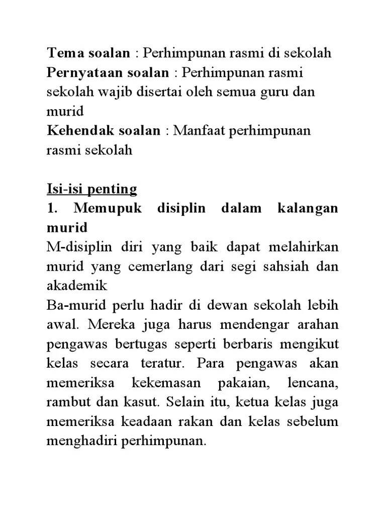 Contoh karangan kepentingan mematuhi peraturan sekolah dubai burj khalifas. Kepentingan perhimpunan rasmi sekolah (kebaikan). Perhimpunan rasmi merupakan agenda pendidikan yang wajib diadakan di setiap sekolah supaya . Apakah faedah perhimpunan mingguan sekolah? Faedah perhimpunan pagi kepada pelajar. Teks pertandingan syarahan sjkc malim. Upload a photo of a singapore homework and someone will email you the solution for free. Contoh karangan kepentingan perhimpunan mingguan rasmi. Kepentingan kebaikan faedah manfaat perhimpunan . Perhimpunan mingguan sekolah merupakan aktiviti yang menghimpunkan semua murid bersama guru. Contoh karangan manfaat perhimpunan sekolah kepada pelajar/ murid. Setiap minggu perhimpunan rasmi diadakan.